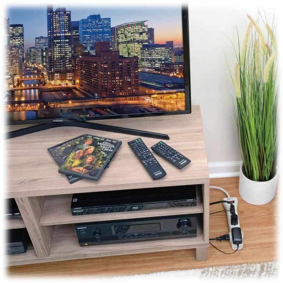 Proteja su computadora, impresora, escáner, enrutador, módem y otros pequeños dispositivos electrónicos del hogar contra sobretensiones peligrosas, picos de voltaje y ruido en la línea con este protector de sobretensiones de siete salidas con enchufe en ángulo recto y clasificación de supresión de sobretensiones de 2160 julios. Se recomienda para cualquier aplicación de escritorio, red o doméstica que requiera protección de línea de CA. El apagado automático corta permanentemente la alimentación a las tomas si el circuito de protección se desactiva, lo que previene daños al equipo e indica que es necesario reemplazarlo. El disyuntor reiniciable de 15 A evita sobrecargas peligrosas. El interruptor de encendido/apagado proporciona control de un solo toque sobre los equipos conectados. Los LED de diagnóstico confirman la conexión a tierra y el estado de protección de un vistazo. El cable de alimentación de CA de 7' permite que el SUPER7 alcance las tomas de corriente cercanas, mientras que su enchufe NEMA 5-15P en ángulo recto permite colocar muebles y equipos a ras de la pared para ahorrar espacio en su estación de trabajo. Las ranuras de ojo de cerradura incorporadas en el panel inferior ofrecen prácticas opciones de montaje en la pared o en el escritorio.