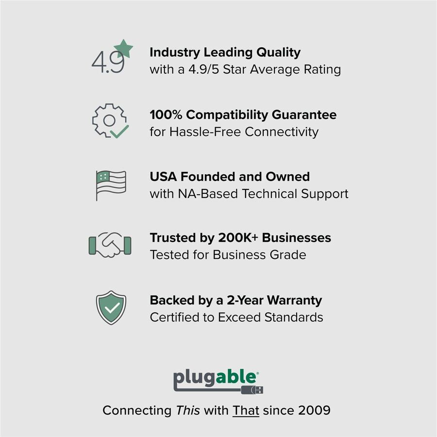 - Garantía y soporte: ¿Tiene preguntas que solo un experto puede responder? Al contactar con nuestro equipo de soporte, se conecta con los ingenieros que diseñan nuestros dispositivos. Todos los productos Plugable cuentan con el respaldo de nuestro equipo de soporte con sede en Seattle, incluso antes de la compra, y una garantía limitada de 2 años en piezas y mano de obra después de la compra.