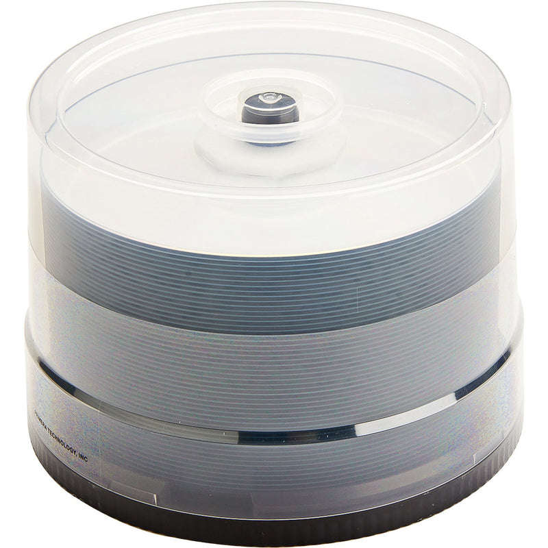 Eje de 50 discos, 700 MB, velocidad máxima de grabación 52x, impresión en blanco, acabado brillante TuffCoat con superficie Water Shield. Esta superficie de impresión altamente resistente al agua protege los discos de la nieve, la lluvia y los derrames.