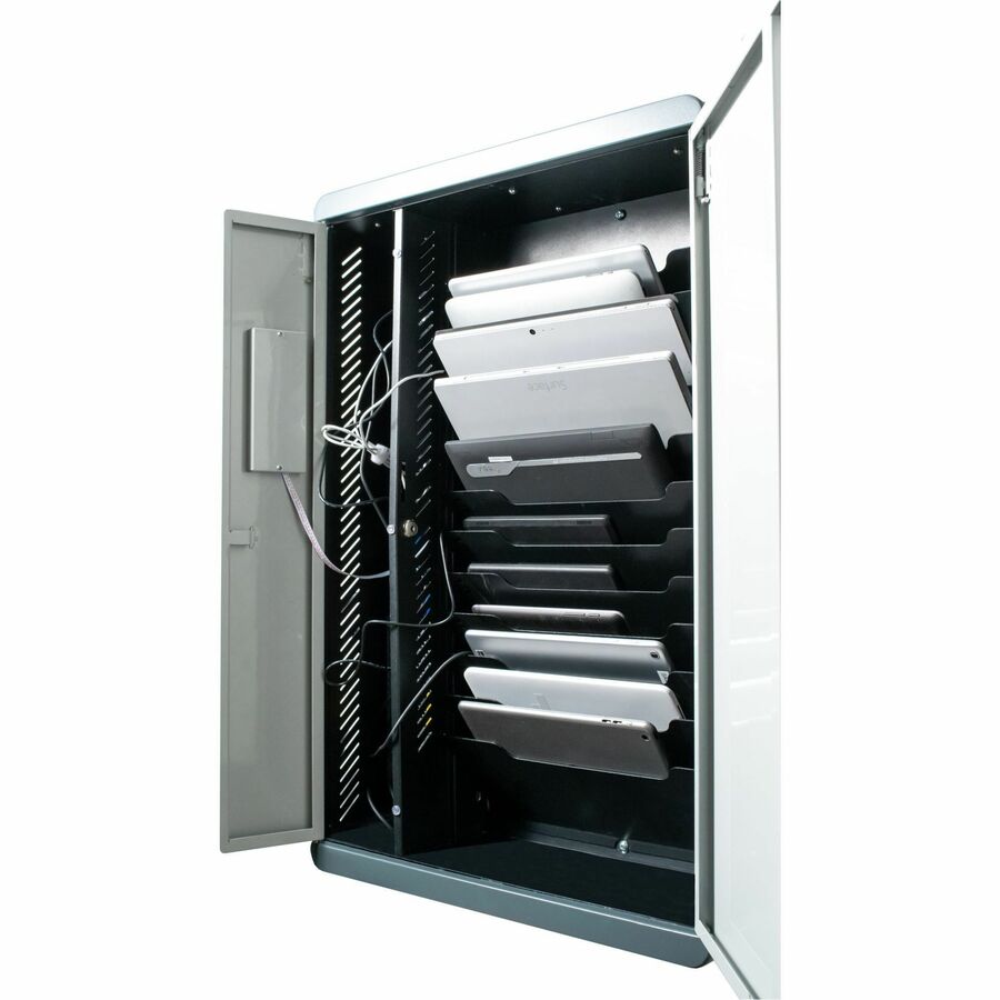 Cualquiera que trabaje con una gran cantidad de tabletas, Chromebooks o portátiles conoce sus dos principales necesidades: seguridad y protección. El armario de seguridad para estación de carga de pared para tabletas ofrece ambas, con un sistema de cierre de tres puntos ultraseguro que protege 12 ranuras de carga capaces de proteger y cargar simultáneamente sus dispositivos. El diseño con clip para cable facilita la gestión de cables. Este diseño compatible se adapta a portátiles, Chromebooks y tabletas de hasta 13" e incluye espacio adicional para cada adaptador de corriente. Y la dedicación de esta estación de carga a la seguridad no se limita a su resistente cierre: un disyuntor integrado protege sus valiosas tabletas de peligrosas sobrecargas, lo que significa que puede dejarlas cargando durante la noche sin preocupaciones. La estación de carga de pared es compatible con las normativas de seguridad FCC, CE, UL2442 e incluso la nueva UL62368-1, y es compatible con tabletas, Chromebooks y portátiles de hasta 13".