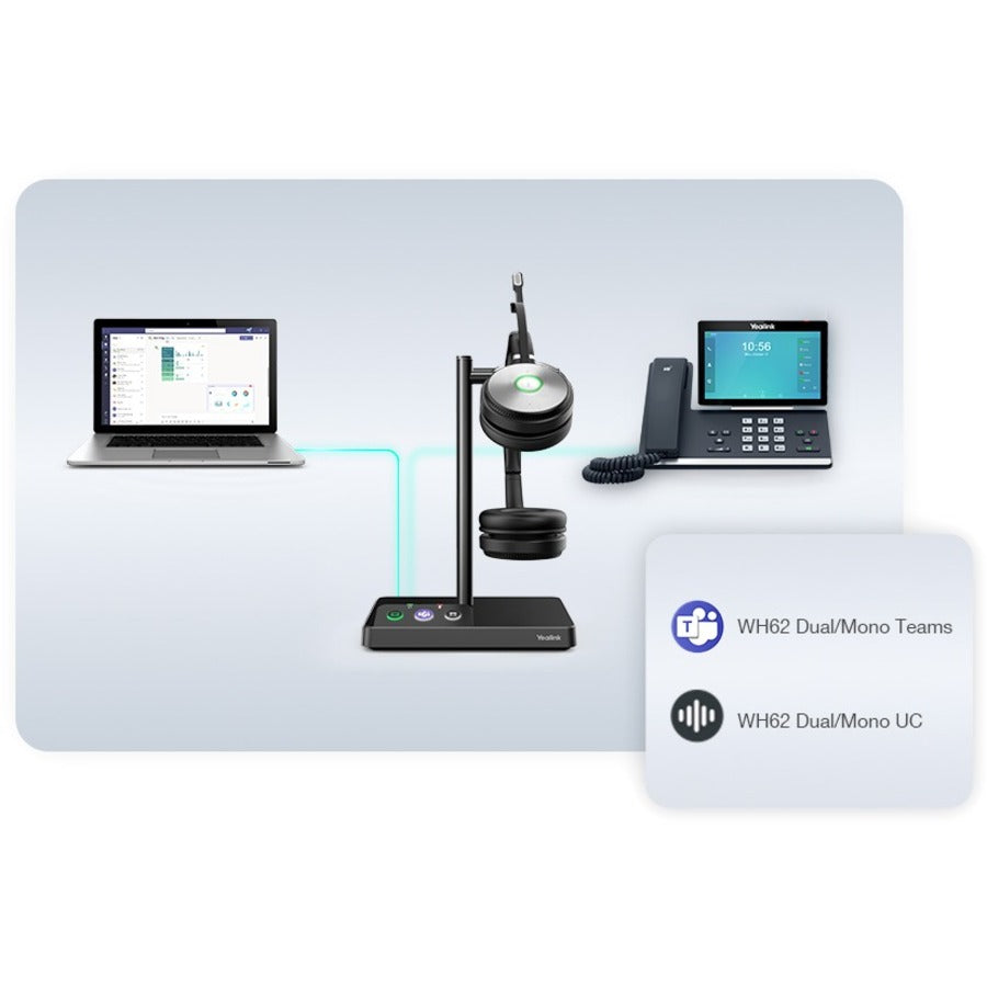 Olvídate de los adaptadores EHS: conecta tu teléfono de escritorio directamente con un solo cable USB. La base incluye dos puertos micro USB que permiten conectarlo simultáneamente a tu PC y a tu teléfono IP. Gracias a su integración con los teléfonos IP de Yealink, disfrutarás de una experiencia de llamada impecable al usar el WH62. Además, es compatible con las plataformas UC más populares, lo que permite una colaboración integral.