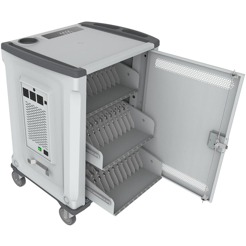 - Compartimentos de la puerta: Dos paneles traseros con cerradura permiten el acceso a los adaptadores de CA (carrito de carga) y al cableado. Ventilación completa: Los ventiladores enfrían las tabletas en el cuerpo principal del carrito.