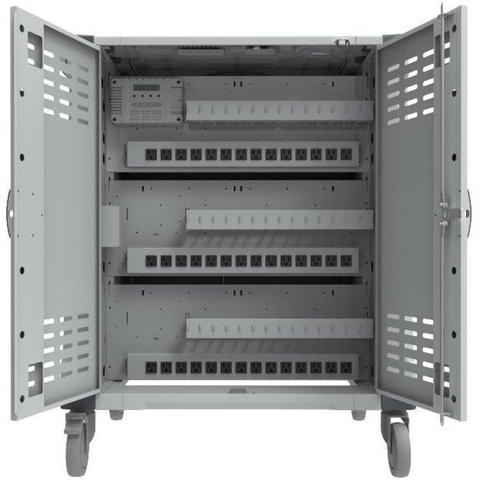 - Compartimentos en la puerta: Dos paneles traseros con cerradura permiten el acceso a los adaptadores de CA (carrito de carga) y al cableado. Ventilación completa: Los ventiladores refrigeran las tabletas en el cuerpo principal del carrito.