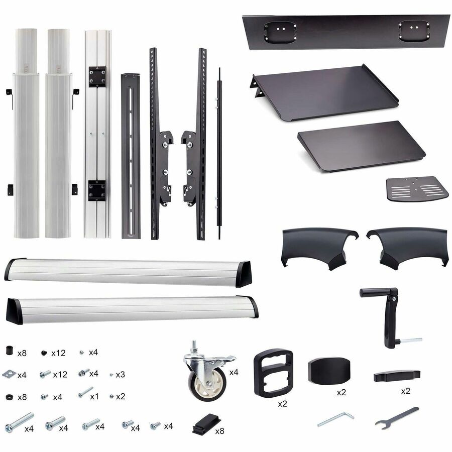 Para mayor portabilidad y personalización, este carrito móvil cuenta con dos estantes multimedia con altura ajustable independientemente debajo de la pantalla, que soportan hasta 5 kg cada uno. El estante para cámara web, ubicado en la parte superior de la pantalla, se puede elevar hasta 2366 cm (93.1") del suelo.