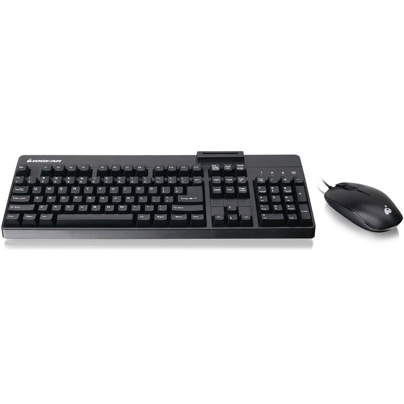 El conjunto de teclado y ratón de IOGEAR, compatible con TAA y con lector CAC integrado, está diseñado para ofrecer alta seguridad en un diseño versátil y portátil. El conjunto incluye un teclado de 104 teclas compatible con múltiples protocolos de tarjetas inteligentes y un ratón óptico con cable de 3 botones.