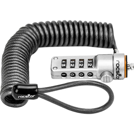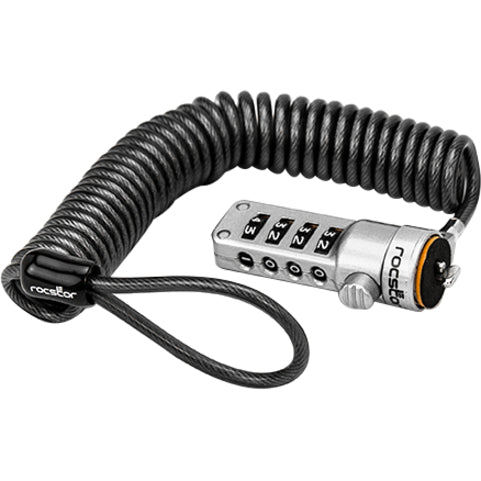 Cable de seguridad portátil Rocstor Rocbolt con candado de combinación y cable de acero autoenrollable - Reiniciable - 4 dígitos - Acero galvanizado, aleación de zinc - 1.8 m - Para portátil, estación de acoplamiento, computadora de escritorio, monitor (compatible con Kensington® K64670AM) CABLE DE SEGURIDAD DE 4 DÍGITOS