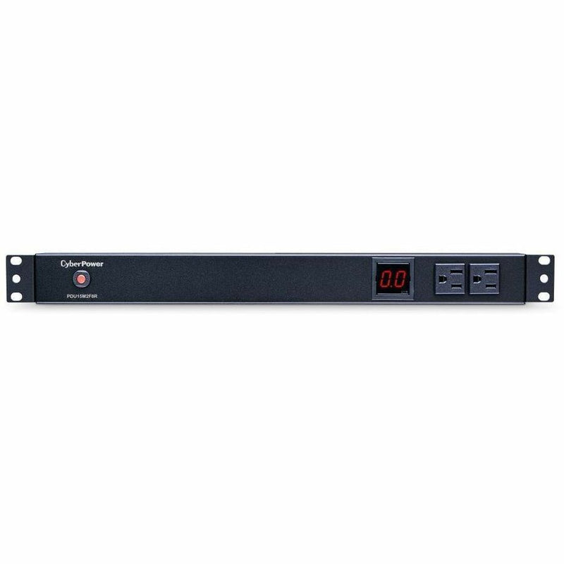 The CyberPower PDU15M2F8R, a 10-outlet (2 front, 8 rear), rackmount metered power distribution unit (PDU), provides 100-125V 15A output. It distributes power to 10 NEMA 5-15R receptacles from a single NEMA 5-15P input with unfiltered electrical pass-through. The current draw for connected equipment is displayed in amps on the front LCD for real-time load monitoring.