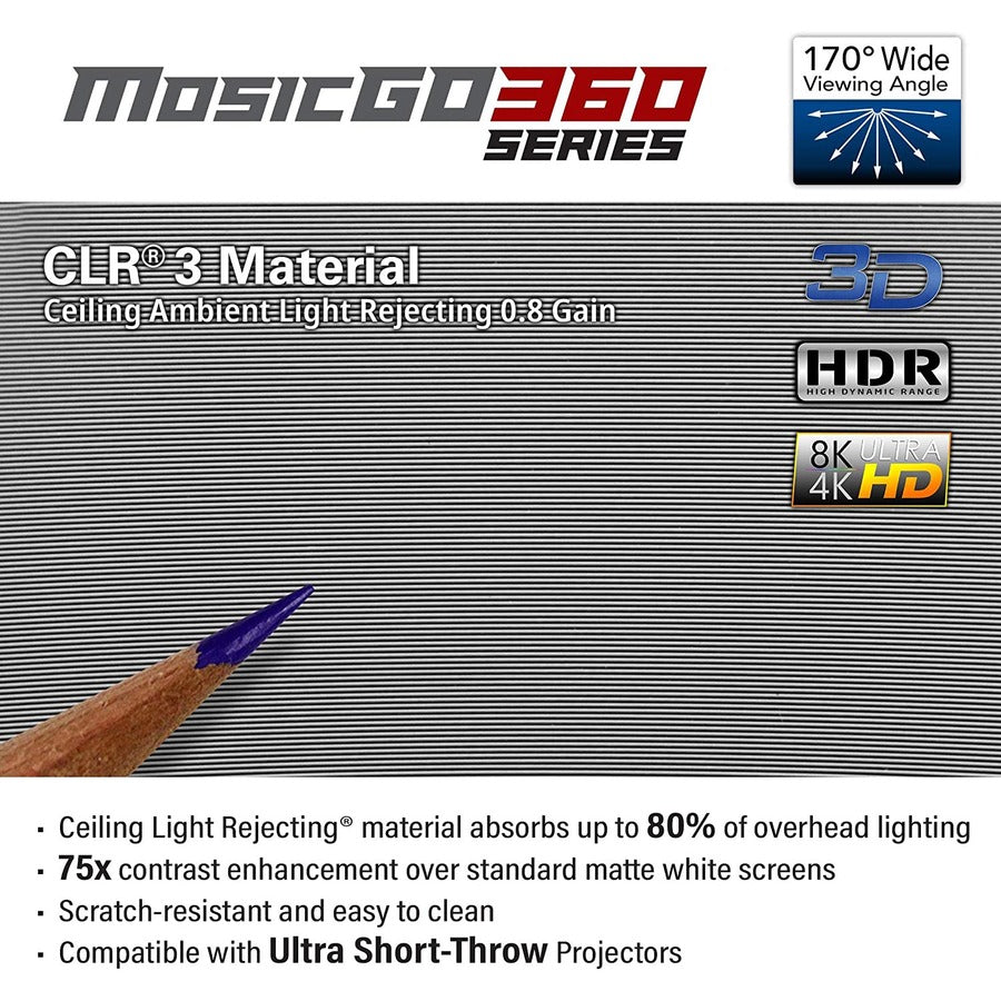 EliteProjector® MosicGO® Serie 360, un proyector DLP de tiro ultracorto para exteriores que incluye pantallas de cine para interiores y exteriores. Ofrece flexibilidad para películas de cine en casa de 103" con rechazo de luz ambiental y de techo en interiores de invierno, videojuegos o películas de camping al aire libre en el jardín durante el verano. ¡Un paquete completo de entretenimiento para llevar!