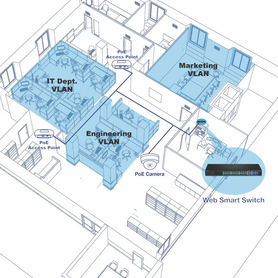 La serie de switches Gigabit Web Smart PoE+ de TRENDnet ofrece funciones avanzadas de Capa 2+ con controles mejorados de gestión de tráfico para satisfacer las cambiantes demandas de las redes de PYMES. Este switch gestionable, compatible con IPv6 y con montaje en rack, incluye una interfaz web intuitiva. Entre sus funciones avanzadas de switch gestionable se incluyen LACP para aumentar el ancho de banda entre switches mediante la agrupación de puertos, VLAN para segmentar y aislar grupos LAN virtuales, QoS para priorizar el tráfico, controles de ancho de banda de puertos y monitorización SNMP, lo que lo convierte en una solución potente para cualquier red de PYMES. Mejore el rendimiento de voz aislando y priorizando el tráfico VoIP del tráfico de datos normal con una función VLAN de voz fácil de usar.