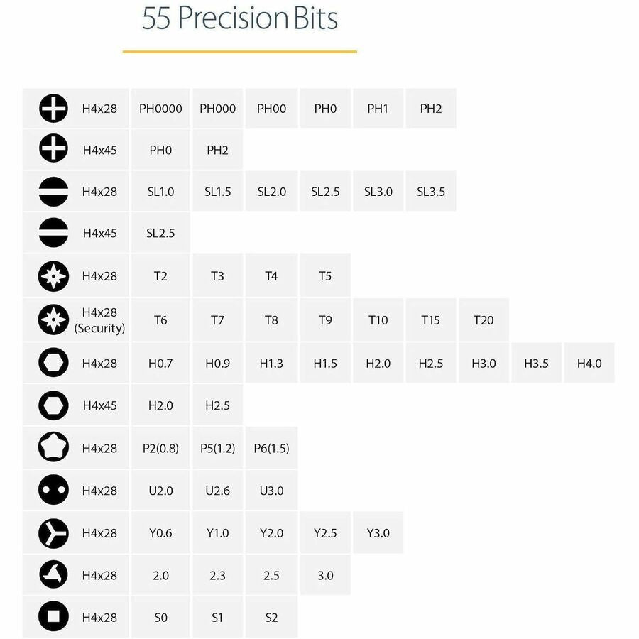 - KIT DE HERRAMIENTAS COMPLETO: El juego incluye destornillador, 55 puntas de precisión (8 Phillips, 7 ranuras, 4 Torx, 7 Torx de seguridad, 11 hexagonales, 3 Pentalobe, 3 llaves inglesas, 5 TriWing, 4 triangulares, 3 Robertson), almohadilla de trabajo magnética, extensor de puntas, magnetizador/desmagnetizador y estuche rígido