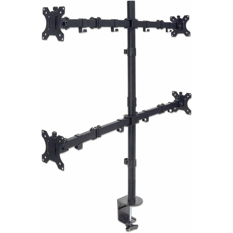Instalar un monitor LCD sobre el escritorio ayuda a maximizar la eficacia de un posible espacio de trabajo. El soporte universal Manhattan para cuatro monitores con brazos articulados de doble articulación mejora la organización del escritorio, facilitando el trabajo en la computadora.