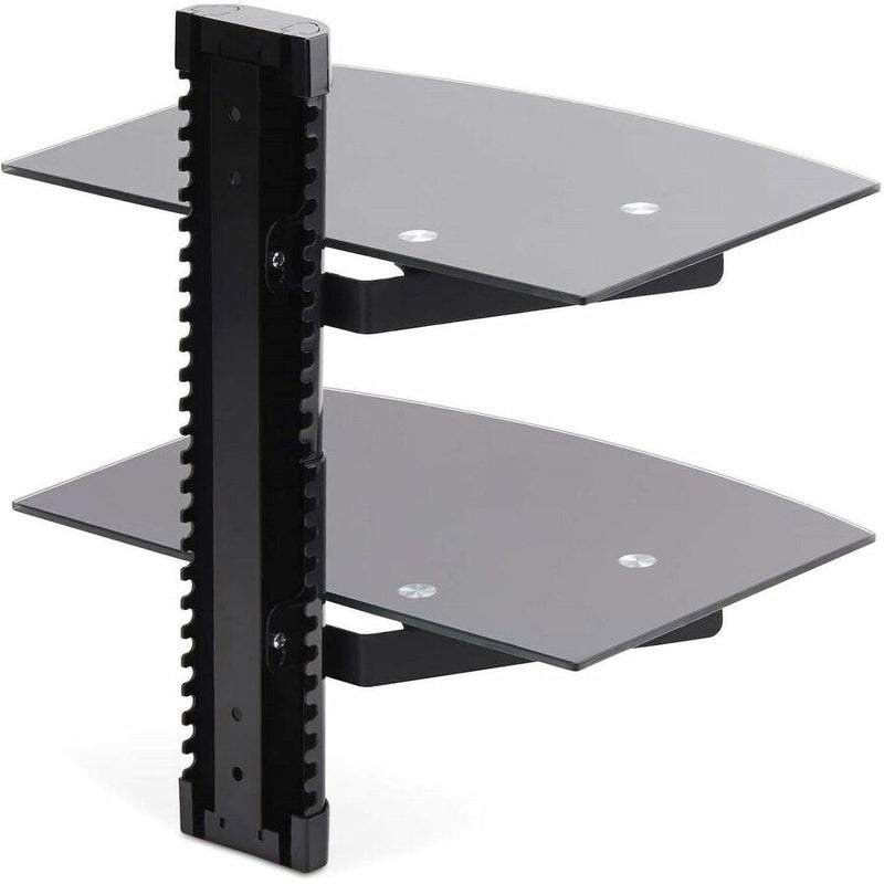El estante AV flotante para montaje en pared cuenta con dos estantes de vidrio templado negro de 5 mm de espesor, que brindan una superficie sin obstrucciones ideal para organizar componentes AV debajo o encima de un televisor o pantalla.