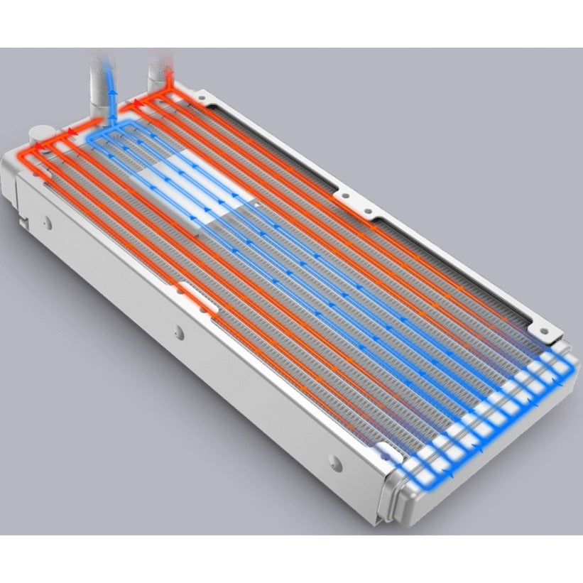 Un camino dividido a través del radiador disipa rápidamente el calor y luego el líquido enfriado se bombea nuevamente al circuito.