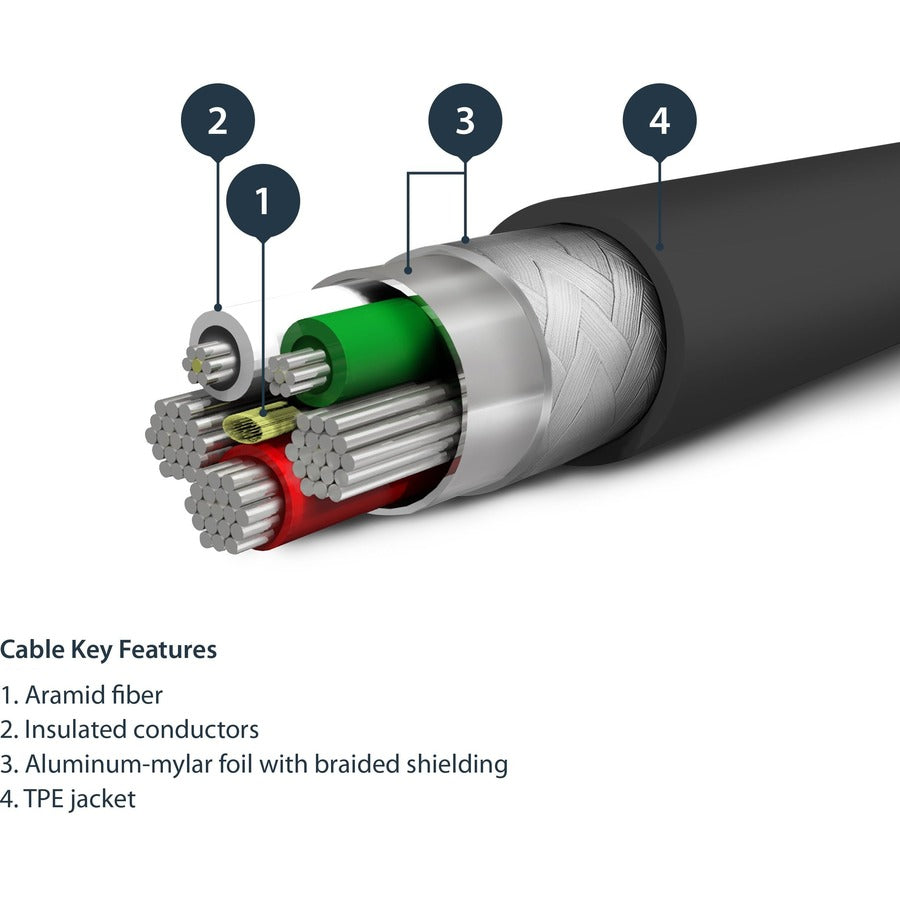 El cable está diseñado para evitar que el conector se separe de la cubierta. El moldeado extralargo de alivio de tensión está probado para soportar más de 10,000 ciclos de flexión en un ángulo de 180°. Además, el moldeado interior mejorado resiste las grietas y reduce los daños en el cable.