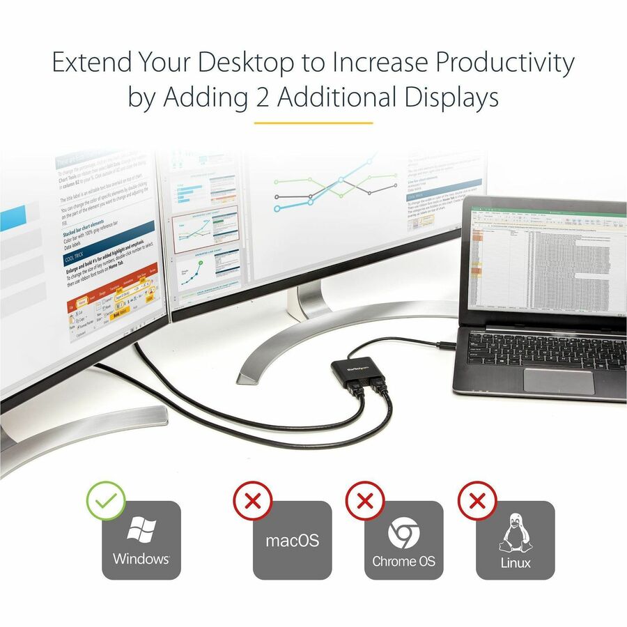Añadir más pantallas a tu estación de trabajo puede ser difícil, especialmente si tu ordenador no es compatible con MST ni ofrece muchos puertos de vídeo externos. Este adaptador USB a HDMI dual cuenta con dos salidas de vídeo, lo que aumenta tu productividad al ofrecerte más espacio de pantalla para trabajar. Con varias pantallas, tienes la libertad de acceder a varias aplicaciones simultáneamente y consultar material en una pantalla mientras compones en la otra.