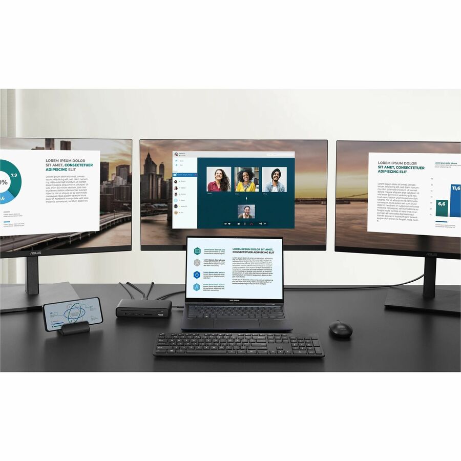 ASUS Triple Display USB-C Dock is a sleek, compact one-stop device that streamlines laptop connectivity. Power your laptop through a single cable, connect to your network and peripherals, and multitask with up to four monitors - including a laptop monitor and three external monitors. It also has an integrated SD card reader for a diverse array of business scenarios. Simply put, ASUS Triple Display USB-C Dock keeps your desk neat, tidy and organized while setting you up for work in the blink of an eye.