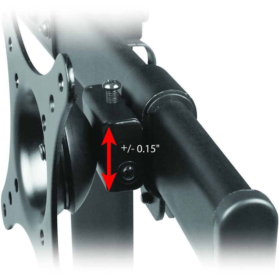 - Adjust monitor support arm height from 9" to 18.5" (228mm to 470mm) and fine-tune individual monitor height +/- 0.15" (+/- 4mm) for proper alignment