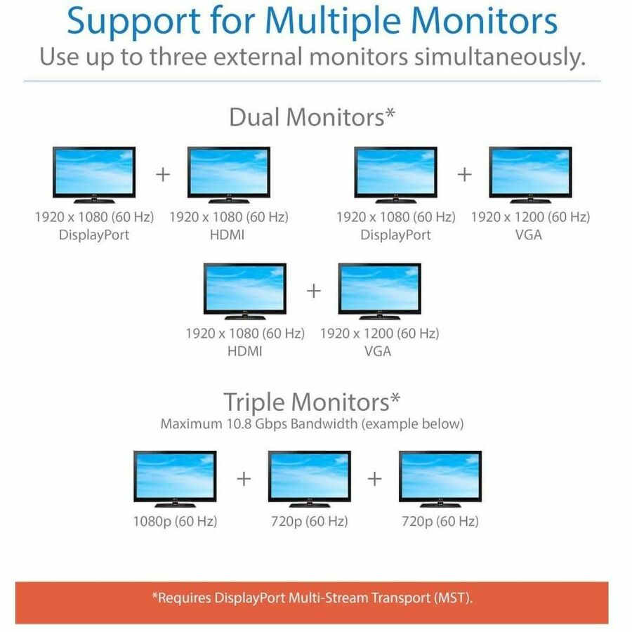 By connecting the detachable USB-C cable to a source that supports DisplayPort MST Mode, you may connect up to three displays simultaneously. This allows you to display the same image on all monitors, extend your host desktop across all with different windows open on each, or combine all into one large display as a video wall. See the included owner's manual for various combinations and video resolutions.