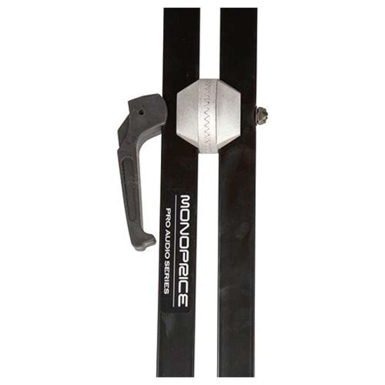 The stand is held in place using a heavy-duty "tooth" grip. A quick-release handle lets you easily lock the teeth in position or unlock them for packing up after the show. The stand can place the keyboard at a maximum height of 38" and it can hold up to 110 lbs in weight.