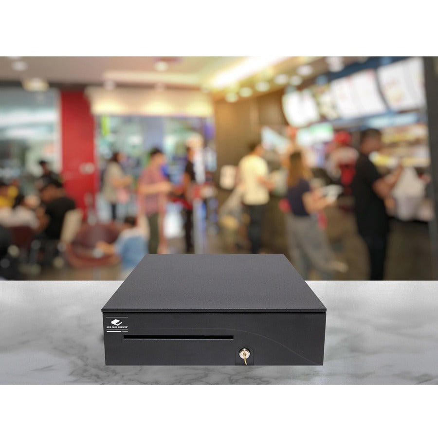 The apg T320-1-BL1616 heavy-duty adjustable cash drawer is black, has a MultiPRO 320 interface and an adjustable media slot, and is suitable at a high-volume point of sale for temporarily storing money. The MultiPRO 320 interface contains an 8P8C (RJ45) modular jack and can be used to connect the cash drawer to a 24V receipt printer or point-of-sale terminal for creating an integrated point-of-sale system (cable, printer, and terminal sold separately). The cash drawer is made of steel for strength and durability and has steel ball bearing slides for smooth operation. The black powder-coated finish resists wear and corrosion. The plastic till has five bill compartments and five coin compartments for organizing money by denomination. Hold-downs keep bills securely in place and flip up for inserting or retrieving bills. A latch releases the drawer when opened and keeps it securely shut when closed. The four-function lock on the drawer has functions to lock the drawer closed, lock open, open electronically using a connected host device, or open manually. A beveled slot allows checks, credit card receipts, or other transaction media to be inserted into the storage area under the till without opening the cash drawer. A divider behind the slot adjusts in position and can be used to organize and segregate different types of media. The cash drawer measures 16.0 x 16.8 x 4.9 inches (W x D x H). (W is width, the horizontal distance from left to right; D is depth, the horizontal distance from front to back; H is height, the vertical distance from lowest to highest point.) It measures 4.6" high without feet. It can be placed on a counter and can support a monitor, receipt printer, or other point-of-sale device (sold separately). Mounting brackets (sold separately) allow the cash drawer to be mounted under a counter to save space. The cash drawer is tested to withstand at least 4 million operations. It has a storage temperature range from -22 to +122 degrees F and an operating temperature range from +32 to +104 degrees F. apg manufactures cash drawers and other point-of-sale equipment. The company, founded in 1978, is headquartered in Minneapolis, MN.