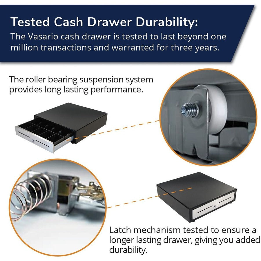 - DURABILITY: This commercial POS standard-duty cash drawer is made of steel for strength and durability. The cash drawer has roller bearings to allow the drawer to slide open and shut. The Vasario Series cash drawer is tested to withstand at least 1 million transactions.