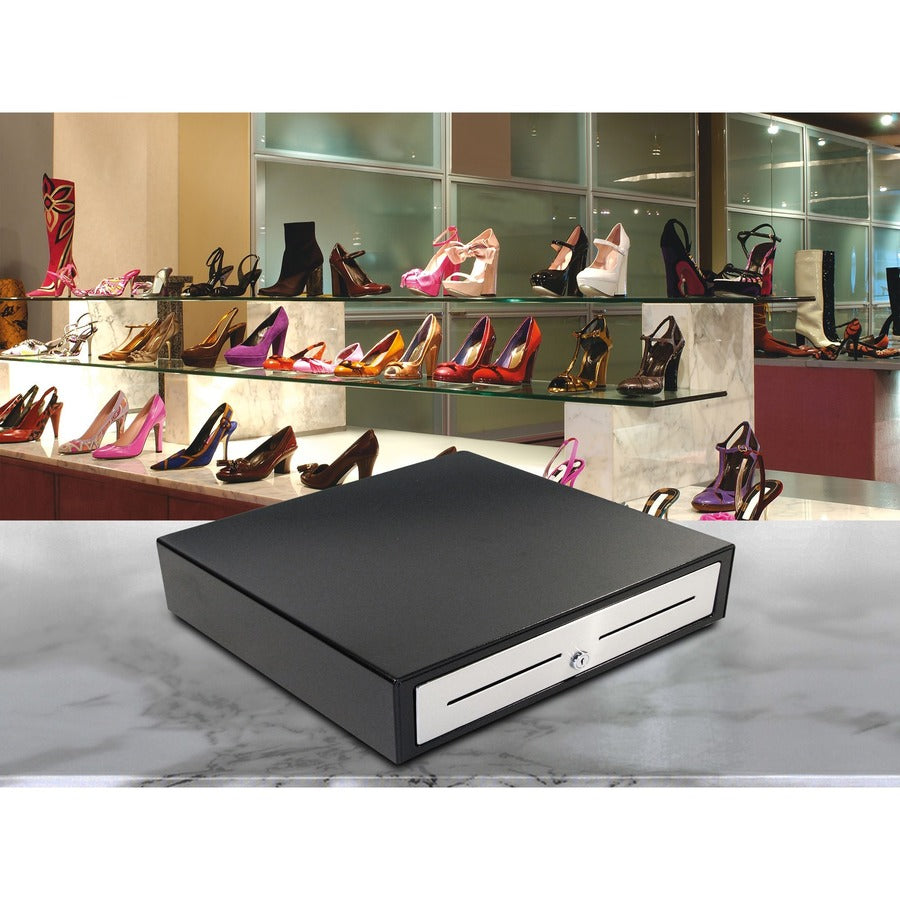 - DESIGN: The black with stainless steel front drawer comes with a plastic till that has five bill compartments and five coin compartments for organizing money by denomination. Finished with two media slots for inserting checks