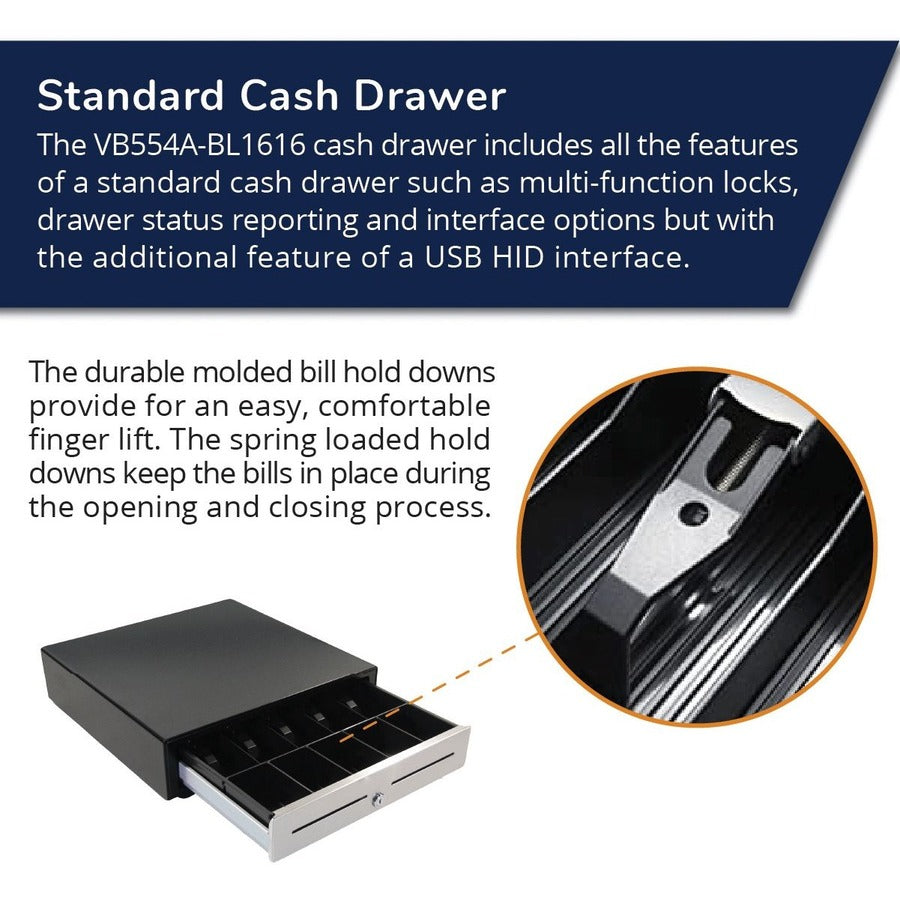 The apg VBS320-BL1616 Vasario Series standard-duty stainless-steel-front cash drawer has a black case and a MultiPRO 320 interface and is suitable at a low- to medium-volume point of sale for temporarily storing money. The MultiPRO 320 interface contains an 8P8C (RJ45) modular jack and can be used to connect the cash drawer to a 24V receipt printer or point-of-sale terminal for creating an integrated point-of-sale system (cable, printer, and terminal sold separately). The cash drawer is made of steel for strength and durability. The stainless steel front resists stains, rust, and corrosion. The black powder-coated finish on the case resists wear and corrosion. Roller bearings allow the drawer to slide open and shut. The plastic till has five bill compartments and five coin compartments for organizing money by denomination. Hold-downs keep bills securely in place and flip up for inserting or retrieving bills. A latch releases the drawer when opened and keeps it securely shut when closed. The four-function lock on the drawer has functions to lock the drawer when closed, lock when open, open electronically using a connected host device, or open manually. Two slots allow checks, credit card receipts, or other transaction media to be inserted into the storage area under the till without opening the cash drawer. The cash drawer measures 16.2 x 16.3 x 4.3 inches (W x D x H). (W is width, the horizontal distance from left to right; D is depth, the horizontal distance from front to back; H is height, the vertical distance from lowest to highest point.) It measures 3.8" high without feet. It can be placed on a counter and can support a monitor, receipt printer, or other point-of-sale device (sold separately). Mounting brackets (sold separately) allow the cash drawer to be mounted under a counter to save space. The cash drawer is tested to withstand at least 1 million operations. It has a storage temperature range from -22 to +122 degrees F and an operating temperature range from +32 to +104 degrees F. apg manufactures cash drawers and other point-of-sale equipment. The company, founded in 1978, is headquartered in Minneapolis, MN.