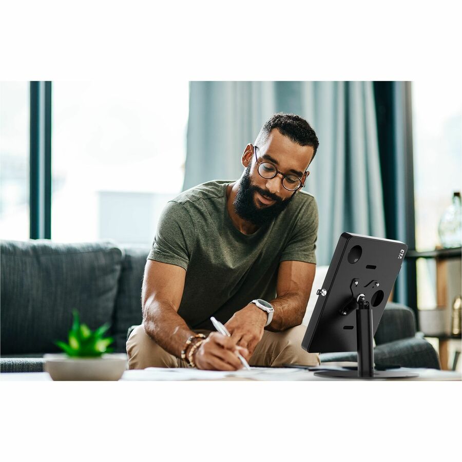 The two words best used to describe this product are "secure" and "convenient." The enclosure's heavy-duty aluminum exterior protects your device from wear-and-tear, while the sturdy lock prevents theft. Meanwhile, the soft rubber grips on the interior keep your device cozy and scratch-free. With the hollow stand, you can invisibly route all the device's cables directly through the stand itself, creating a clean, professional look. Two 360-degree swivels - one at the base and one at the mount - make the Hyperflex perfect for personable point-of-sale transactions. For added security, you can use the included galvanized steel locking cable to doubly secure your device by locking one end directly to the stand and tethering the other to any nearby fixture.