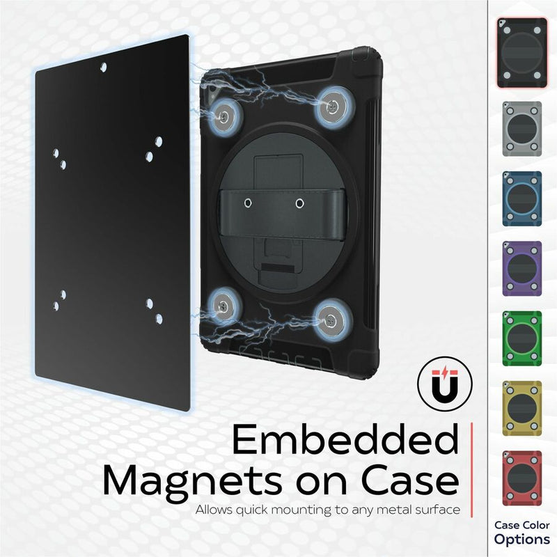 Enjoy fast, effortless handheld-to-wall setups with CTA Digital's Magnetic Splash-Proof Case for iPad. This rugged tablet case employs powerful embedded magnets at its rear to enable instant mounting to metal surfaces. Mount your tablet on the wall of any kitchen, garage, engine room, the gym, or even on your refrigerator. No metal wall to fix it to? No problem: Also included are magnetic mounting plates, one large and two small, plus adhesive mounting strips, so that you can create fast, drill-free magnetic surfaces for your tablet anywhere you like. Use the table stand at your desk, on a countertop, or on-the-go. The splash-proof, impact resistant case is designed to allow full access to your tablet's ports, speakers, and home button. Compatible with iPad 8th Gen 10.2", iPad Air 4, iPad Pro 10.5" , and others.