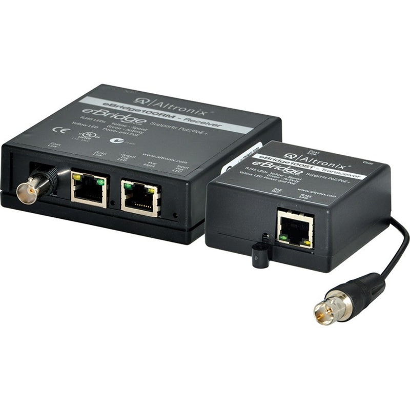 Ethernet over coax/CAT5e Receiver/Mini Transceiver adapter kit - Transmits IP video/data over coax up to 300m or CAT5e up to 500m @ 100mbps full duplex and supports PoE (IEEE 802.3af) or PoE+ (IEEE 802.3at). UL/cUL Listed (UL60950-1). CE Approved.