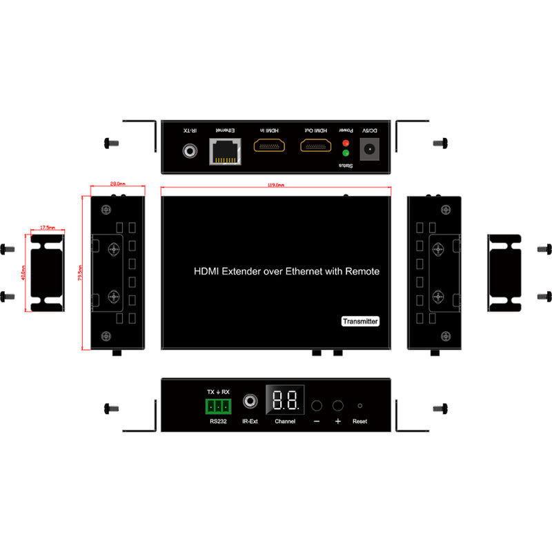 The KanexPro EXT-AVIPH264TX is an AV over IP transmitter with an HDMI input and Ethernet out which uses advanced H.264 compression algorithm to transmit full HD 1080p from HDMI based sources with less bandwidth over LAN network. It supports PoE (power over Ethernet) with distances over a single CATx up to 394 ft. (120m) delivering one to one, one to many and many to many over the Ethernet switch.