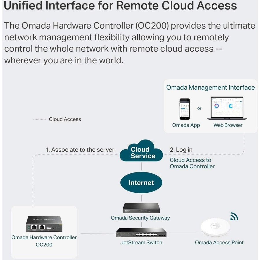 OC200, the professional on-premises hardware controller for the Omada Software Defined Networking (SDN) platform, provides 100% centralized management of Omada access points, JetStream switches, and Omada routers-all controlled from a single interface.