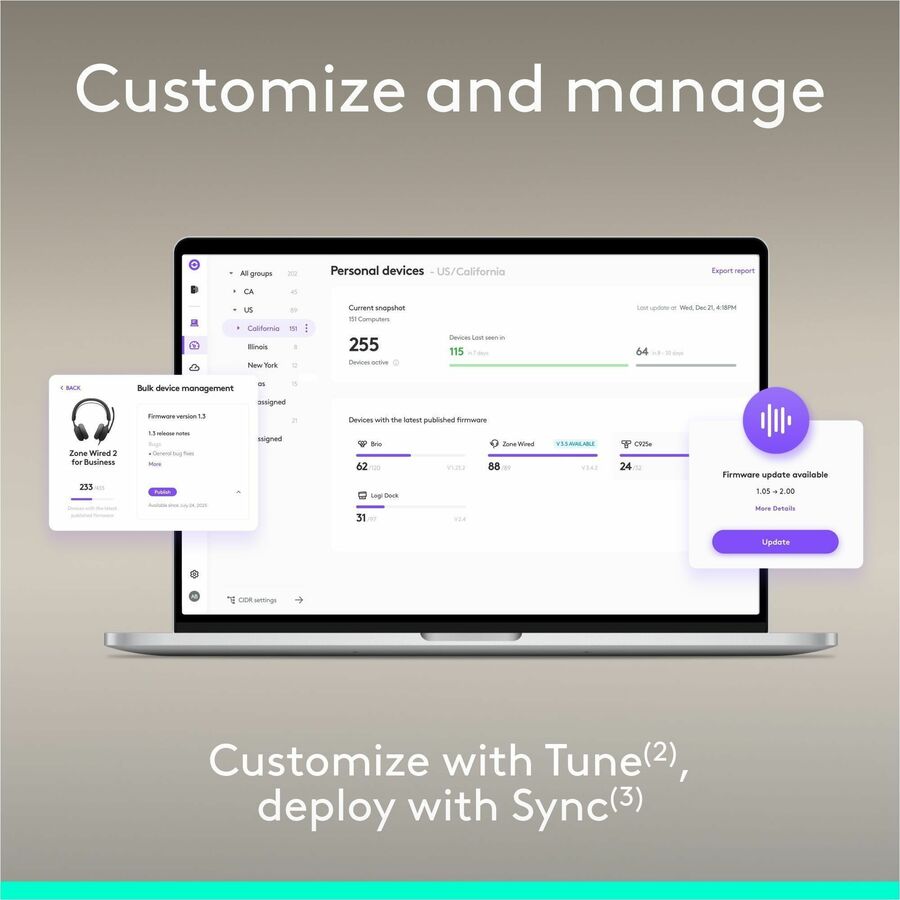 Remote management through Logitech Sync provides insights regarding usage and enables silent updates without user interruption. It's also designed for sustainability and product longevity, including easily replaceable components for extended use and recycled plastics, fabric, and magnets. It's a headset you'll feel good about.