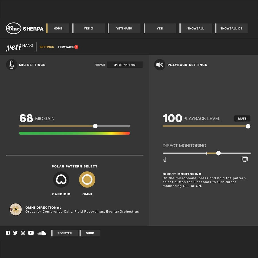 For quick direct control, the Blue Sherpa companion app helps you get the most out of this powerful computer microphone. Mute and unmute your mic and headphones, fine-tune gain and levels, switch polar patterns, and change sample rates. Sherpa will also download firmware updates directly to your Yeti Nano, seamlessly keeping you up to date.