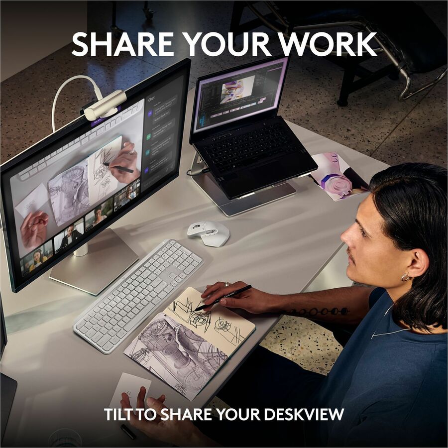 - Share Your Work: Tilt down your Logitech webcam to share notes and sketches on your desk with Show Mode, allowing for better collaboration on calls