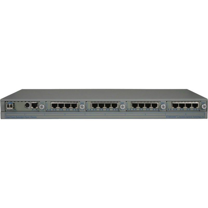 The iConverter 5-Module Chassis is designed for Enterprise Local Area Network (LAN) and Metropolitan Area Network (MAN) applications where fault tolerance and reliability are essential. The 1U (1.75 inch) high iConverter 5-Module Chassis has redundant power supplies and can be mounted in a 19-inch or 23-inch rack.