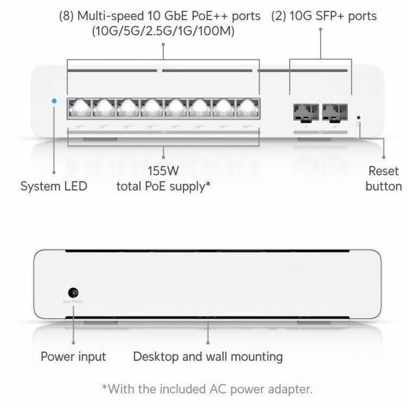 Compact desktop/wall-mountable, professional-grade 8-port, Layer 3 Etherlighting PoE++ switch with (8) 10 GbE and (2) 10G SFP+ ports.