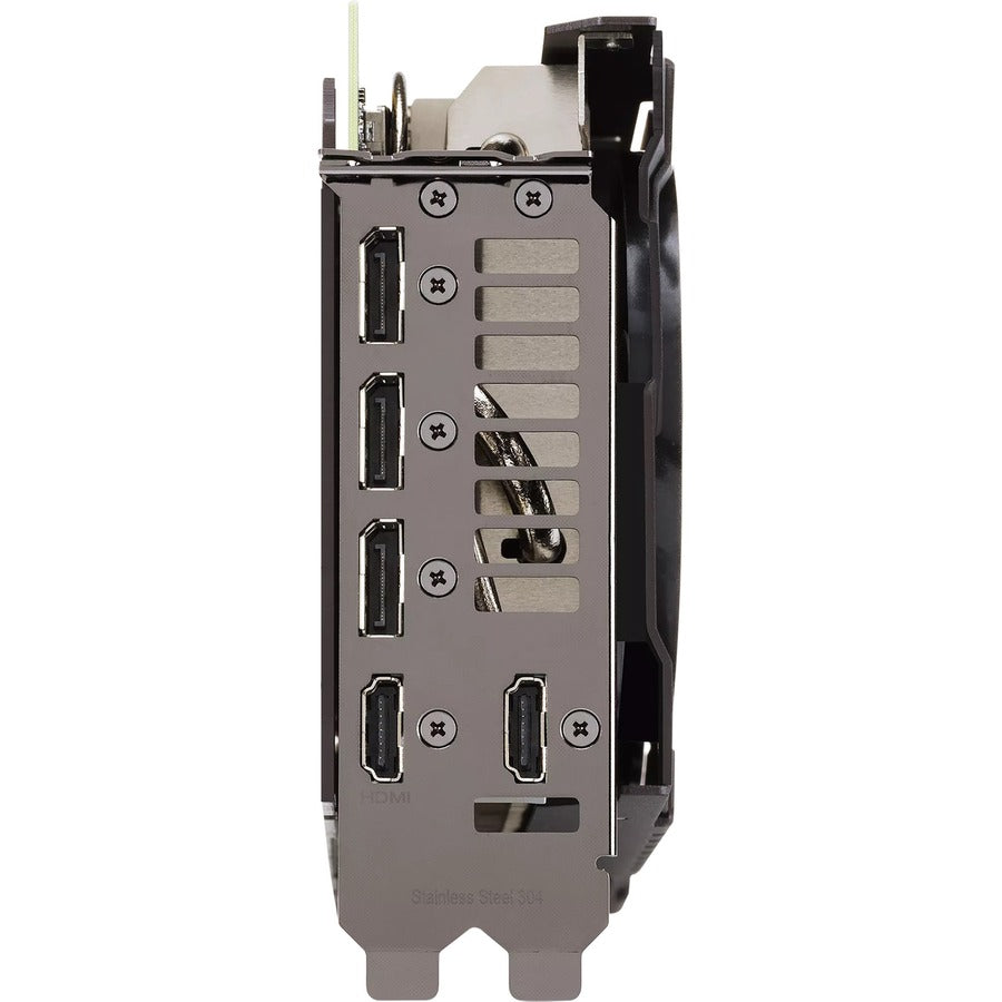The heat spreader draws heat up into heatpipes that carry it through a fin stack that fills most of the card's large, 2.7-slot footprint. This generation of?TUF Gaming graphics cards also feature a dedicated heatsink for VRAM to keep temperatures well under maximum operating specs.