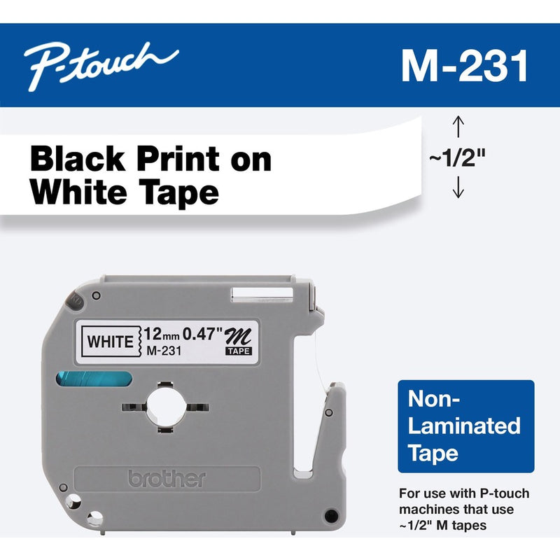 Create labels for home, home office, school or hobby applications using this 1/2" Black on White tape. It is designed for use with Brother P-Touch machines including PT-100, PT-110, PT-45M, PT-55BM, PT-55S, PT-65, PT-65SB, PT-65SCCP, PT-65SL, PT-65VP, PT-70, PT-70BBVP, PT-70BM, PT-70BMH, PT-70DIY, PT-70HK, PT-70HOL, PT-70HOT, PT-70SP, PT-70SR, PT-80, PT-80EU, PT-80SCCP, PT-85, PT-90 and PT-M95. Nonlaminated tape is perfect for indoor and light use. It yields 26.2'.