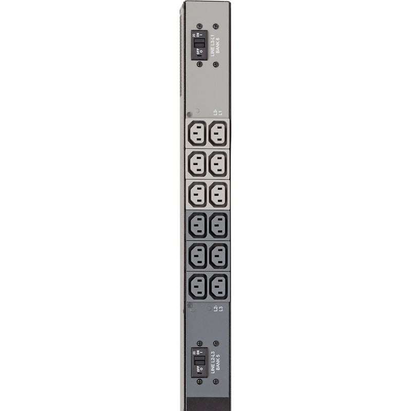 During normal operation, 36 C13 outlets distribute AC power to connected equipment. Each 200/208/240V outlet is accompanied by an LED that illuminates when the outlet is ramped up and ready to be used. The outlets are split into six load banks, each protected by a 20A circuit breaker that trips if the bank's connected load exceeds its maximum load rating. Plug-lock insert sleeves are included to prevent connected cables from becoming accidentally dislodged.
