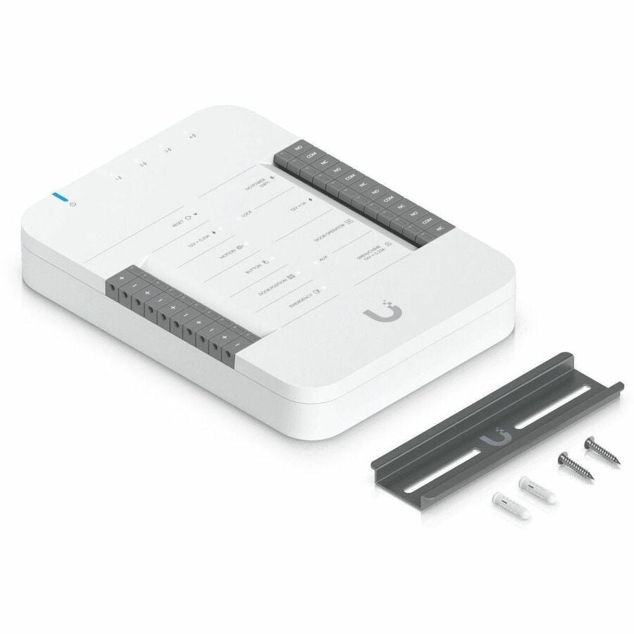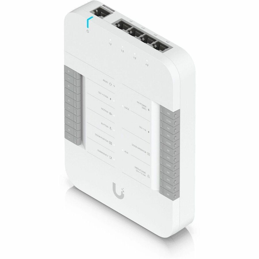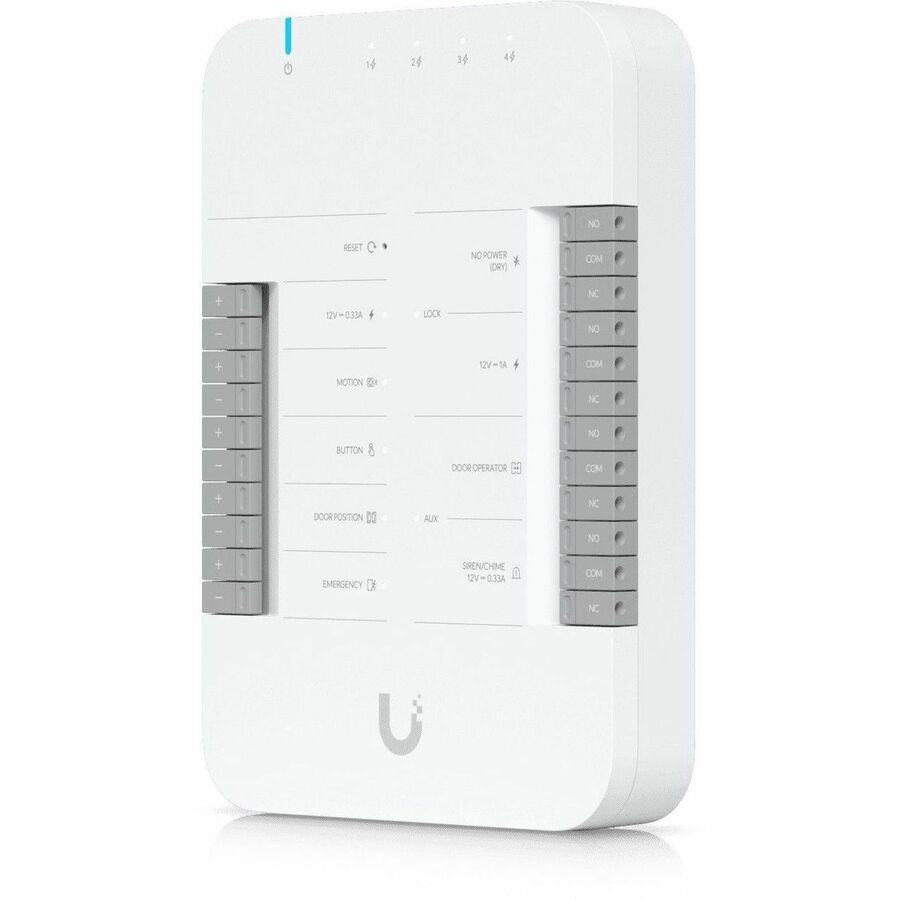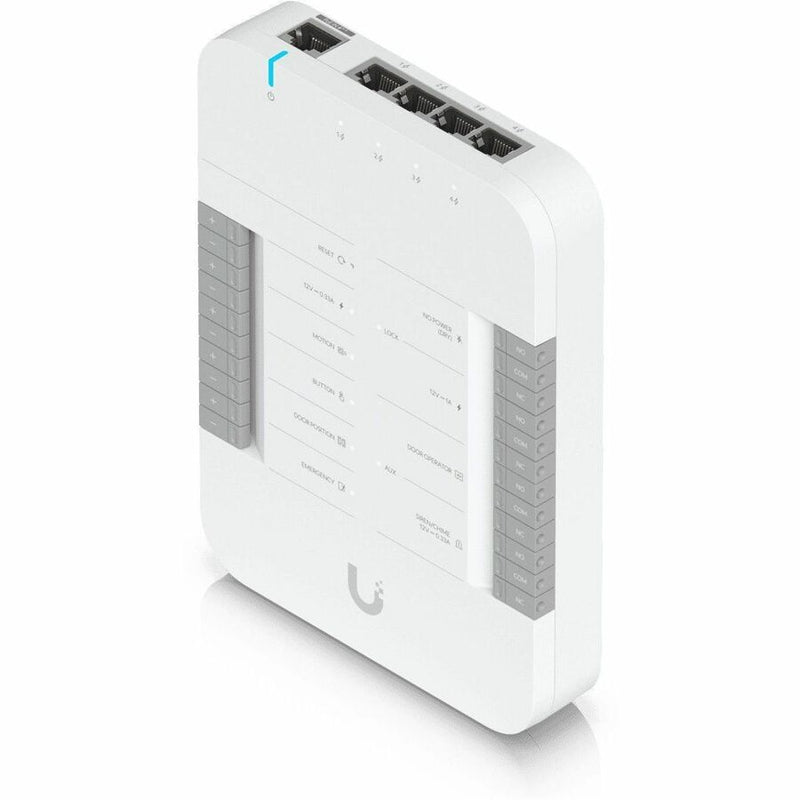 A single-door mechanism that provides complete entry and exit control via connected Access Readers. (2) Lock terminals (12V and Dry) (2) AUX terminals for an external siren and automatic door opener (4) Additional inputs (sensors and buttons) Connect and power using PoE++ Connect to two UniFi Access readers and two UniFi Protect camera or UniFi Protect Chime.
