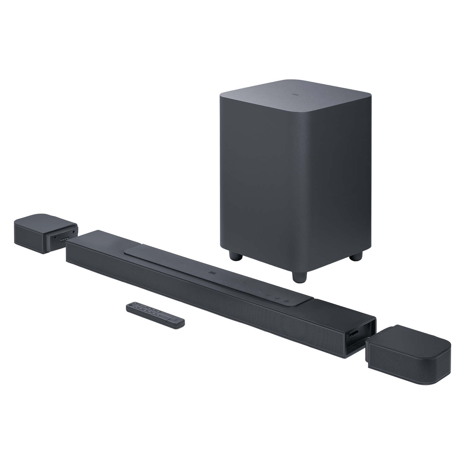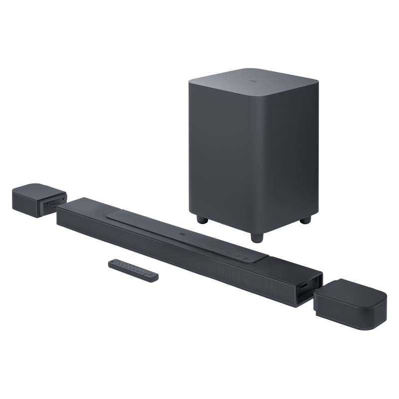 JBL BAR 700 5.1-channel soundbar with detachable surround speakers and Dolby AtmosMake movie night soar and let your music move you to new heights with 620W of total output power and thrilling bass from the 10 subwoofer. The JBL Bar 700 with Dolby Atmos R technology includes detachable battery-powered surround speakers to create an immersive 3D cinema experience without having to draw extra cables. Youll never miss a word with our PureVoice technology which makes sure dialogues are clear even when other sounds are at their loudest. And when youre ready to cut loose stream your favorite music from AirPlay Alexa MRM or Chromecast built-in. Your get togethers will never be the same.Product FeaturesWith detachable surround speakers and Dolby Atmos technology the JBL Bar 700 delivers a 3D cinematic experienceEnjoy real surround sound without the hassle of extra wires and power connectionsThrilling precise bass from a mighty 10 wireless subwooferPureVoice dialogue enhancement technology620 watts of total system power transforms your entertainment into immersive sound experiencesBuilt-In Wi-Fi with AirPlay Alexa Multi-Room Music and Chromecast built-inHDMI eARC with 4K Dolby Vision pass-throughEasy sound calibration delivers the best 3D surround effects for any interior and room layoutJBL One app helps you easily set up the soundbar personalize settings and browse the integrated music servicesVoice assistant compatibilityDetachable surround speaker playtime up to 10 Hours1 HDMI video input 1 HDMI video output with Enhanced Audio Return Channel eARCAudio inputs 1 Optical Bluetooth Chromecast Built-in AirPlay and Alexa MRM USB USB playback is available in US version. For other versions USB is for Service only.Includes Main soundbar 2 Detachable wireless surround speakers Wireless subwoofer Remote control with 2 batteries 2 Power cords HDMI cable Wall-mount bracket kit with screws 4 Side capsWarranty Card contains the full terms and conditions of the warranty.