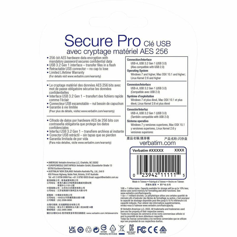 Verbatim 64GB Store 'n' Go Secure Pro USB 3.0 Flash Drive with AES 256 Hardware Encryption - Silver est en rupture de stock et sera expédié dès qu’il sera de retour en stock.