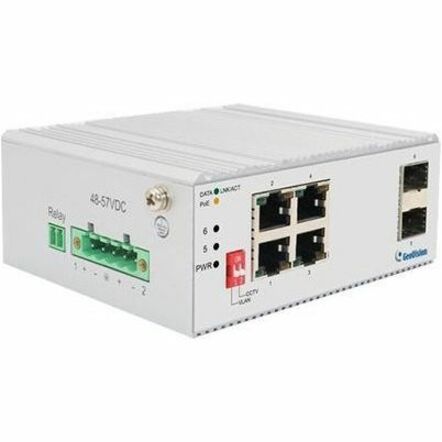 GV-APOE0410-E is an industrial-grade, unmanaged PoE switch with 4 PoE+ 10/100/1000 BaseT(X) ports and 2 Gigabit SFP ports. The switch supports IEEE 802.3at Power over Ethernet standard with up to 30 W per port and a maximum power consumption of 125 W. It not only eliminates the need for power cables to connect your powered devices (PD), such as IP cameras, but it also allows power supply over cables up to 250 m (820 ft) in length, at 10 Mbps.