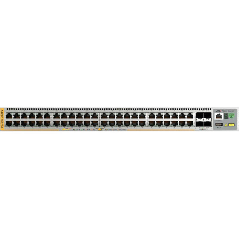 The x530L-52GPX stackable Gigabit Layer 3 switch is high-performing and feature-rich, with 48 x 100M/1G PoE+ ports, and 4 x 10G uplinks.