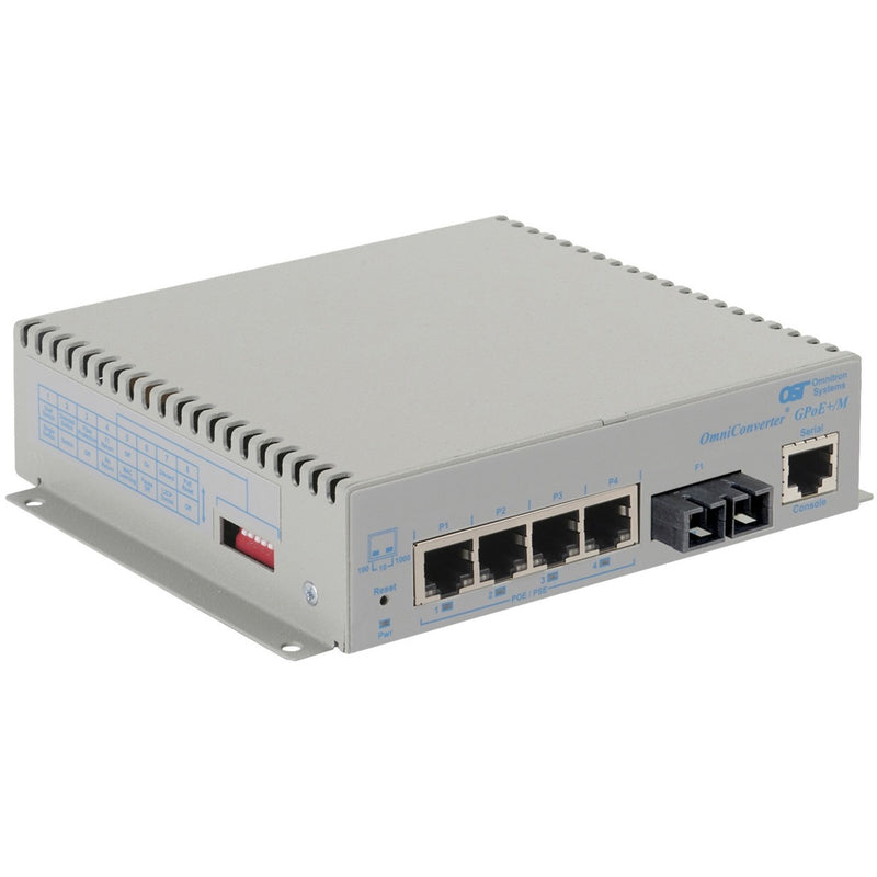 The OmniConverter GPoE+/M is a compact managed PoE and PoE+ Ethernet fiber switch that features one or two Gigabit fiber ports and four or eight 10/100/1000 RJ-45 copper Power Sourcing Power-over-Ethernet ports. The GPoE+/M enables network distance extension with fiber cabling and provides PoE+ power to all RJ-45 ports.