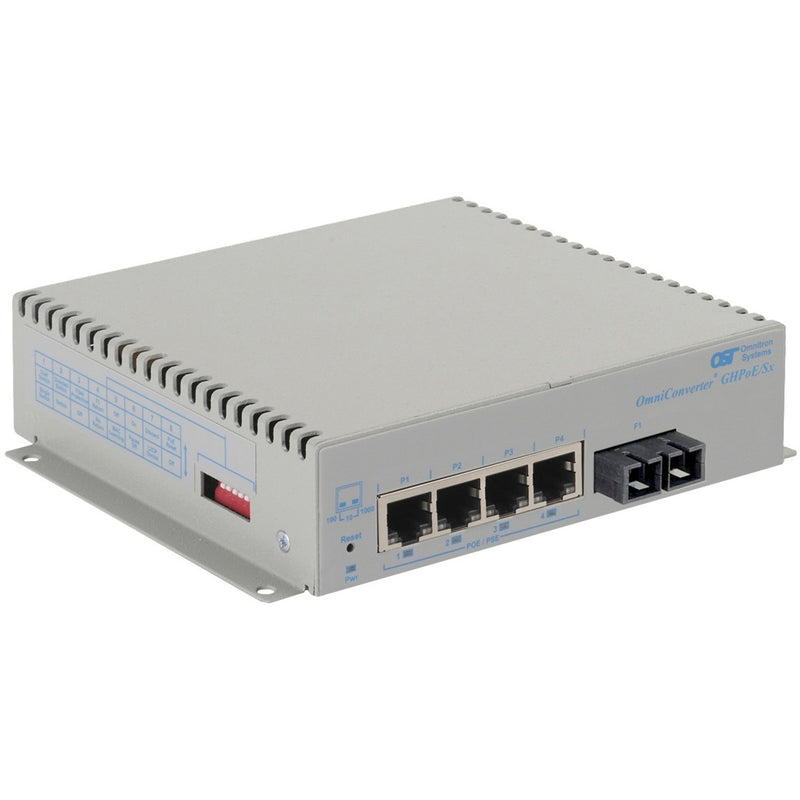 The OmniConverter GHPoE/Sx is a compact unmanaged High-Power PoE Ethernet fiber switch that features one or two Gigabit fiber ports and four 10/100/1000 RJ-45 copper Power Sourcing Power-over-Ethernet ports. The OmniConverter GHPoE/Sx provides PoE, PoE+, and High-Power 60W PoE (also called 4 Pair PoE, PoE++, or UPoE) per RJ-45 port for outdoor pan-tilt-zoom cameras with heaters and blowers, and multi-stream wireless access points. The GHPoE/M switch enables network distance extension with fiber cabling.