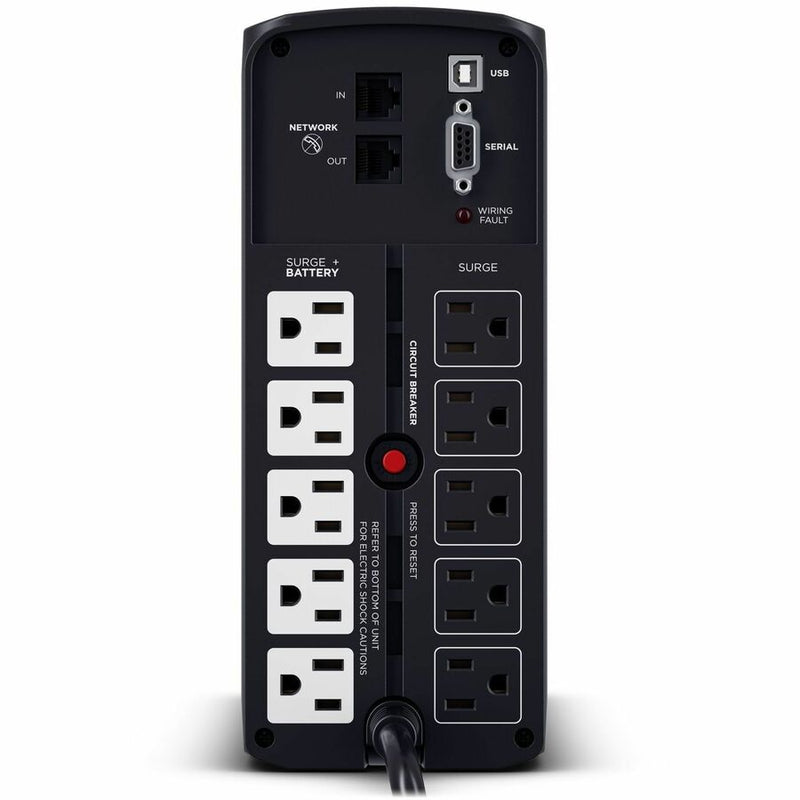 The CP850PFCLCD features an advanced multifunction control panel with a color LCD to quickly confirm status and alerts at-a-glance. The screen tilts for easy viewing when the UPS is placed in a low position such as under a desk.