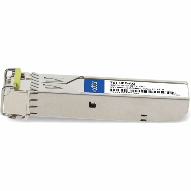 This Accedian® 7ST-002 compatible SFP+ transceiver provides 10GBase-BX throughput up to 80km over single-mode fiber (SMF) using a wavelength of 1550nmTx/1490nmRx via an LC connector. This bidirectional unit must be used with another transceiver or network appliance of complementing wavelengths. It is guaranteed to be 100% compatible with the equivalent Accedian® transceiver. This easy to install, hot swappable transceiver has been programmed, uniquely serialized and data-traffic and application tested to ensure that it will initialize and perform identically. Digital optical monitoring (DOM) support is also present to allow access to real-time operating parameters. This transceiver is Trade Agreements Act (TAA) compliant. We stand behind the quality of our products and proudly offer a limited lifetime warranty.