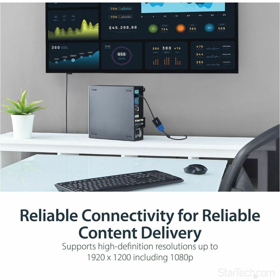 • DISPLAYPORT TO VGA ADAPTER: DisplayPort 1.2 (HBR2) adapter connects a VGA display or projector supporting 2048x1152, 1920x1200 & 1920x1080 (1080p) at 60Hz; EDID & DDC pass-through ensure compatibility between source & display